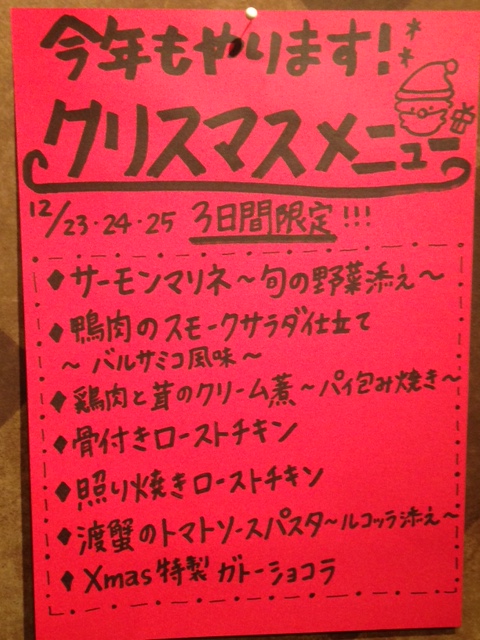 ☆☆ 今日からクリスマスメニュー ☆☆ こんにちわ!! 練馬熟成肉バル カウぼーずです!! 今日はクリスマスイブイブですね!! 今日からカウぼーずでは23・24・25の3日間限定のクリスマスメニューやっちゃいます!! お席も早い時間帯などはまだ 空きも有ります!! ご家族・友人・カップルで 是非カウぼーずへ!! 肉とワインでクリスマスパーティーしましょう(^^ メリークリスマスっ!! カウぼーずでした!! < 前のお知らせ 次のお知らせ >