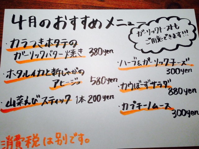 ☆☆ 今日から!!! ☆☆ こんにちわ! 練馬 熟成肉 カウぼーずです!! 今日は天気は最高ですけど風が強いですね~~! 皆さん如何お過ごしでしょうか?? 今日からおすすめメニューが新しくなりました(^○^) 私の押しメニューは 「ホタルイカと新じゃがのアヒージョ」 そのまま食べるも良し、バケット一緒に食べるも良し! 美味です!! 今日はまだまだお席に空きがあるので、是非どうぞ~~!! 北風に負けずに今日も肉焼いてます!! カウぼーずでした ♪ < 前のお知らせ 次のお知らせ >